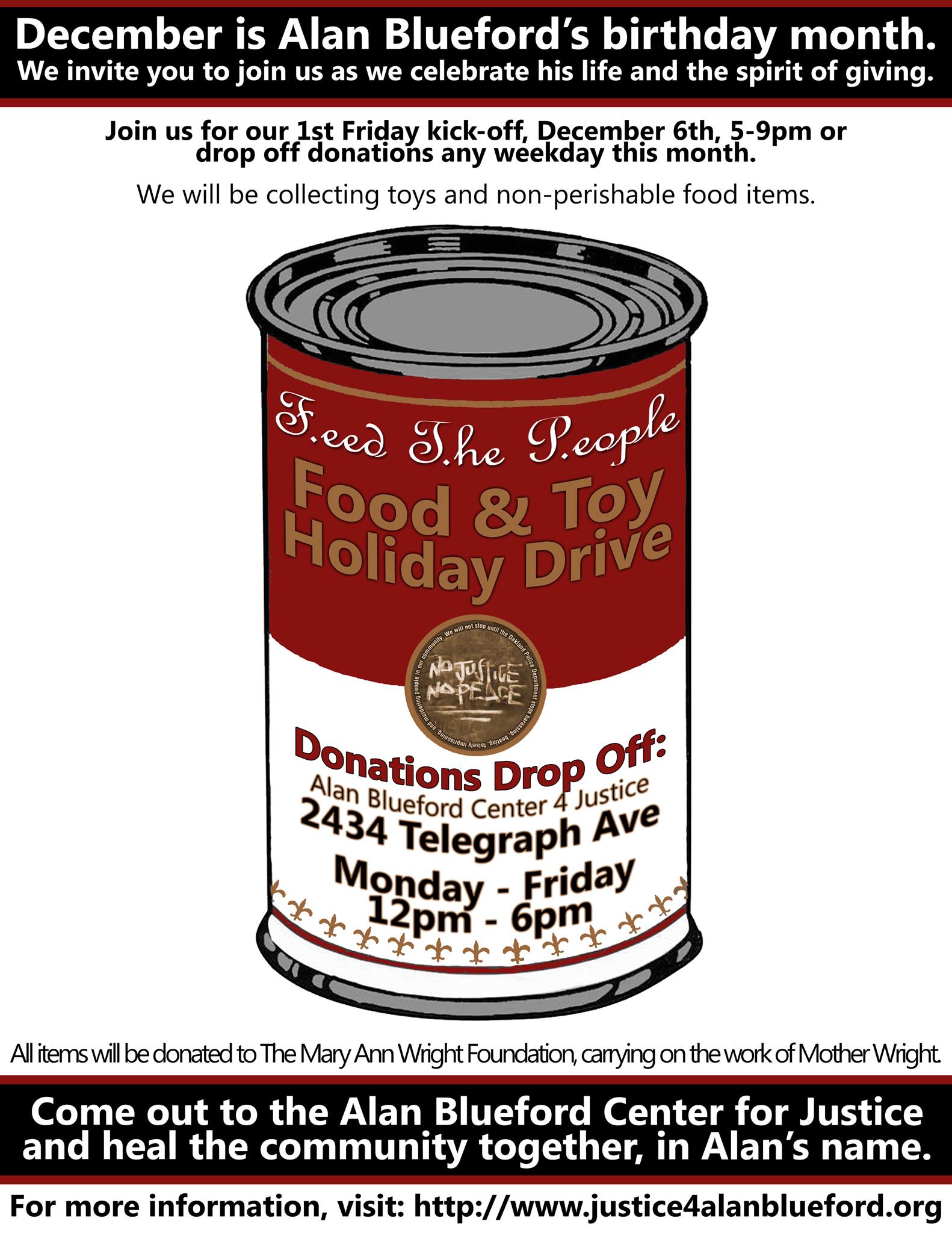 Please join the Justice 4 Alan Blueford coalition for 1st Friday on Dec 6th at The Alan Blueford Center 4 Justice located at 2434 Telegraph Ave in Oakland as we kick off our Holiday Donation drive–details are in the flyer–if you can’t make it today, please come by any weekday between noon-6pm to drop off a donation of a toy or non-perishable food–everything collected will be given to the Mary Ann Wright Foundation to add to the work they’ve been doing for years to address homelessness & hunger in our communities.