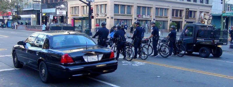 police cruisers, mountain bike cops, motor bike cops, ATV’s, helicopters, vans…a lot going on for a peaceful demonstration protesting the over-militarization of the police…. — at Stop Urban Shield Oakland: RALLY @ MARRIOTT!